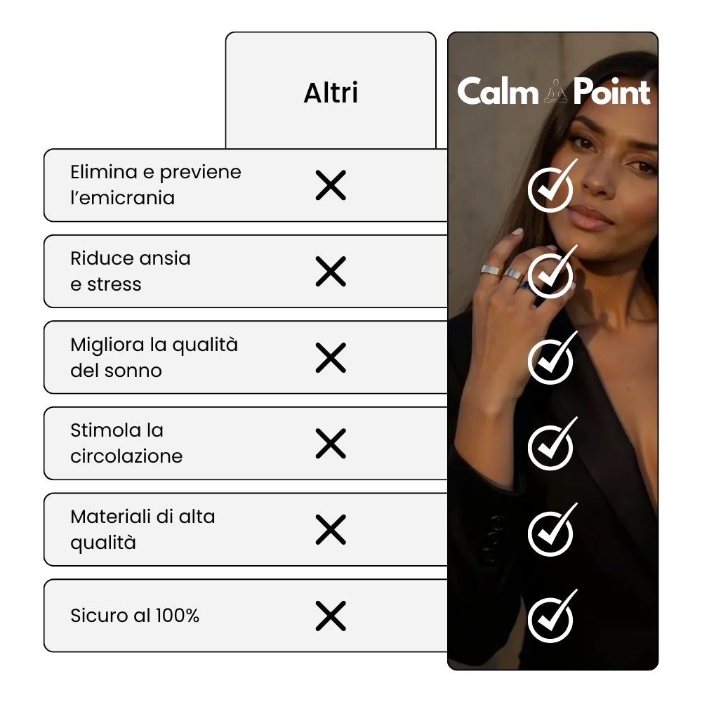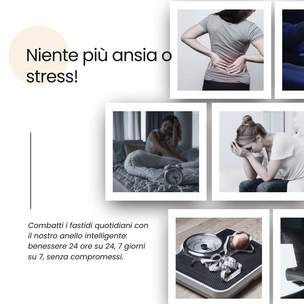 Il nostro anello aiuta a ridurre emicrania, ansia e stress, migliora il sonno e favorisce il rilassamento muscolare, offrendo un benessere generale naturale tutto il giorno.